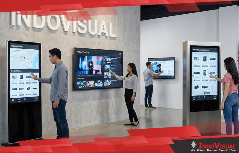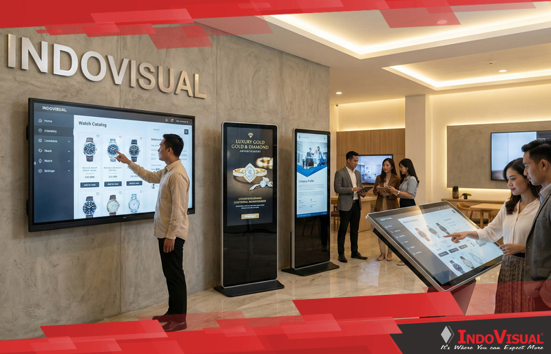 Dalam sektor retail, layar sentuh 55 inci berperan sebagai katalog digital interaktif yang menampilkan seluruh lini produk tanpa dibatasi ruang fisik. Pelanggan dapat menelusuri spesifikasi, membandingkan produk, hingga melihat stok atau promo terkini secara mandiri. Pada showroom otomotif atau properti, layar ini sering digunakan untuk simulasi visual seperti konfigurasi warna, fitur, hingga tur virtual, yang mampu meningkatkan engagement dan mempercepat proses pengambilan keputusan pembelian.